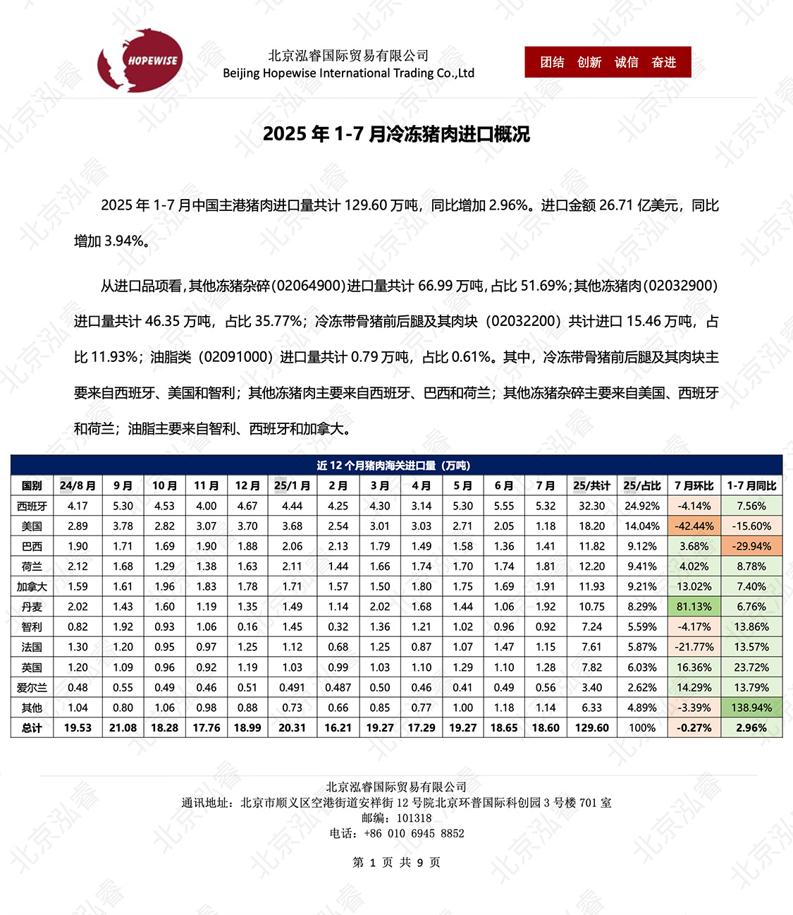 2025 年 1-8 月冷冻猪肉进口概况