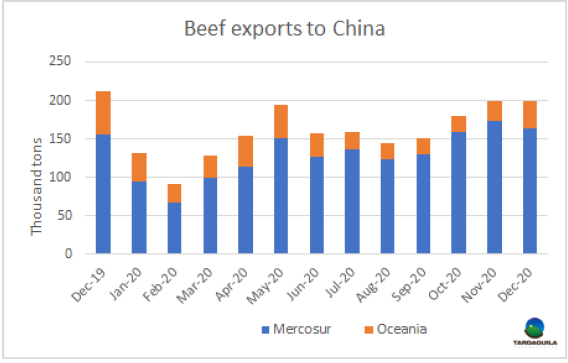 根据主要出口国的出口数据和阿根廷的预估出口数据,12月全球两大主要供应商南美和澳洲对中国出口量保持20万吨,与11月水平相当。11月和12月出口数据的差异在于澳洲的出口量占比增大,尤其是来自新西兰的出口量,新西兰出口量约2万吨,达2019年12月以来最大。新西兰的出口量增加是由于船期变短了。因为这些产品需在春节前到港。目前,南美目前的大部分12月装船的产品很难赶上春节到港。南美对中国出口量约达16.3万吨,较11月减少了1万吨。12月澳洲对中国牛肉出口量3.5万吨,较11月增长了9%。12月这两个地区的出口量较2019年12月下降了12%,尽管南美地区对中国出口量增长了7%,也没能抵消澳洲对中国出口量同比2万吨的下降。